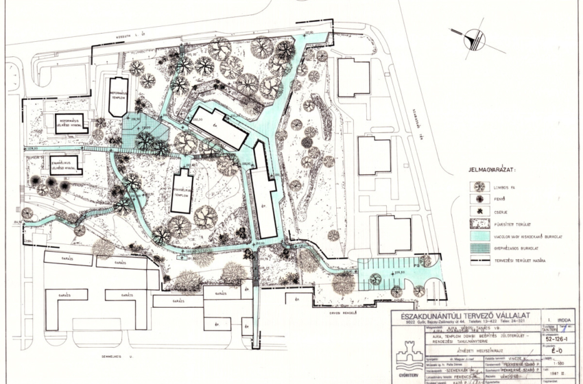 Fotók: Lechner Tudásközpont / Kis Ádám A Torna és Csinger patak találkozásánál fekszik Ajka, a környékbeli falvak egyesítésével létrejött egykori szocialista bányászváros. A XX. századi iparosodásnak köszönhetően a településkép megváltozott, azonban a központban elhelyezkedő Templomdomb megőrizte eredeti vonásait. Az itt fekvő kertet a nyolcvanas évek végén hozták rendbe; az átalakulásokról a Lechner Tudásközpont tervtárában őrzött sárguló iratok mesélnek. Környékbeli kistelepülések egybeolvasztása révén jött létre Ajka, mely kedvező fekvése miatt nagy múltra tekint vissza, már a XI. században falvakat alapítottak ezen a területen. A környéken található bauxitra és szénre alapozott nehéziparnak köszönhetően 1959 novemberében lett hivatalosan város, nagyjából tíz évvel később szükségessé vált egy szocialista városközpont kialakítása. A helyiek a középkorban is különös vallási tisztelettel tekintettek a ma Templomdombként ismert magaslatra, ugyanis a község legelső, a romok alapján nem azonosítható szerzetesrendhez tartozó temploma is itt állt. Helyén ma az Evangélikus templom fekszik, melynek építését 1789-ben fejezték be. Tőle néhány lépésnyire található a Református templom, melyet 1782-83 között építettek barokk stílusban. Iparosodás A XX. század második felére Ajka településszerkezeti viszonyai radikálisan átrendeződtek, köszönhetően a szénnek, az üvegnek, az agyagnak, a kézművességnek és a pártállam határozott intézkedéseinek. Az iparosítással a település fejlődési ritmusa kezdetben nehezen tudott lépést tartani; poros, macskaköves utak, alacsony, földszintes házak veteményeskertekkel, kopott közintézmények jellemezték a városképet; sőt az sem volt szokatlan, hogy valaki szarvasmarhát tartott a város közepén. A falusias városkép azonban hamar átalakult; a bányászat és nehézipar egyik központjaként a foglalkoztatottság kiszélesedett, ami magával hozta a település szinte teljes egészében történő átváltozását. Rohamos tempóban épültek a lakótelepek, hogy befogadják a környékből ideérkező gyármunkásokat. Felgyorsult a tervszerűtlenül telepített magánházak lebontása, valamint a régi falu központjának teljes szanálása is, melynek helyén igazi szocialista városközpont jött létre. A kialakulóban lévő új életforma nagy hatással volt a mindennapokra, az Ajkán 13 évet élő Fekete István Gyeplő nélkül című regénye a változó idők szorongásait eleveníti meg. A várossá avatást követően több városrendezési koncepció is készült, ezek azonban különböző okok miatt nem valósulhattak meg. Módosított tervezetre volt szükség, amelyet 1975-ben készített el a Győri Tervező Vállalat veszprémi kirendeltsége a VÁTI – a Lechner Tudásközpont jogelődje – közreműködésével. A tervszerű városfejlesztés a Templomdombot a radikális átépítésektől megkímélte, kertje érintetlenül maradt, ám a nyolcvanas évek második felére a park állapota beavatkozást igényelt. A Városi Tanács 1986 tavaszán megrendelt Ajka templomdombi részén egy „Múzeumkert”kialakítására vonatkozó tervet. „A funkcionális célú átalakításokon túl csupán az esztétikai igények szintje és egységes kialakítása érdekében szükséges munkák kerülnek elvégzésre” – írja a beépítés tanulmányterve, melyet a Lechner Tudásközpont tervtára őriz. Az üde zöldfelülettel rendelkező vallási sziget tereprendezése 1987-ben kezdődött meg. A Templomdombon idős, nagy fák uralják a teret a mai napig. Az új kertészeti koncepcióba nem illő, illetve méretüknél vagy koruknál fogva át nem ültethető fákat a tereprendezés során kivágták, hasonló sorsra jutottak a gyökérsarjról kialakult bozótosok is. A gyepnyeséses, bozótirtásos területeket füvesítették. A meglévő lépcsőket, burkolatokat, támfalakat, és a lépcsőt kísérő korlátokat elbontották, ezekkel a megoldásokkal teljesen új, rendezett külsőt kölcsönöztek a két templom által körülölelt kertnek. A területen lévő épületeket is érintette a tereprendezés, funkcionális átalakításon estek át; így lett az iskolából a ma is működő Ajkai Városi Múzeum és Fotógaléria. Az egységes kép kialakításához a múzeumi épületeket, a két templomot és a két lelkészi hivatalt sétautakkal kapcsolták hozzá a környezethez. A templom és a múzeum melletti területen elhelyezkedő nagy fák megtartása érdekében az evangélikus templomhoz vezető lépcsőt beton támfalakkal alakították ki. A kert használhatósága érdekében a református templom mellett szabadtéri kulturális rendezvények megtartására alkalmas helyet formáltak, mely a mai napig iskolai megemlékezések helyszínéül szolgál. A tereprendezés során 16 lombos fát és 6 fenyőt ültettek, valamint a lépcsők kísérőjeként, a terek lezárásánál további 1306 örökzöld és 731 lombhullató cserje kiültetése szerepel a tervezetben. Faültetési lista a kert felújítási tervében: Lombos fa Vadgesztenye 3 db Mezei juhar 3 db Virágos kőris 2 db Nyugati platán 1 db Kocsányos tölgy 5 db Nagylevelű hárs 2 db Fenyő Virginiai boróka 6 db Lombhullató Sárga cserszömörce 48 db Veresgyűrű som 49 db Téli jázmin 45 db Széleslevelű fagyal 69 db Közönséges jezsámen 40 db Kerti gyöngyvessző 32 db Fehér hóbogyó 88 db Kislevelű hóbogyó 360 db Örökzöld cserje Júlia borbolya 79 db Skogholm kúszómadárbirs 584 db Közönséges borostyán 24 db Örökzöld orbáncfű 90 db Örökzöld mirtuszlonc 412 db Közönséges mahónia 117 db Forrás: Giay Frigyes – Város a Torna partján (1989) GYŐRITERV, Templomdombi beépítés tanulmányterve, Ajka (1987) GYŐRITERV, Templomdomb, beépítési munkáiról, kö