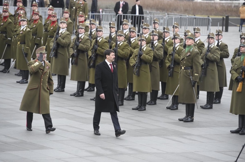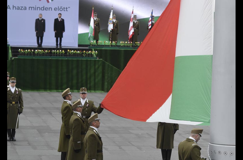Katonai tiszteletadás mellett felvonták a nemzeti lobogót a március 15-ei nemzeti ünnepen, csütörtök délelőtt az Országház előtt.